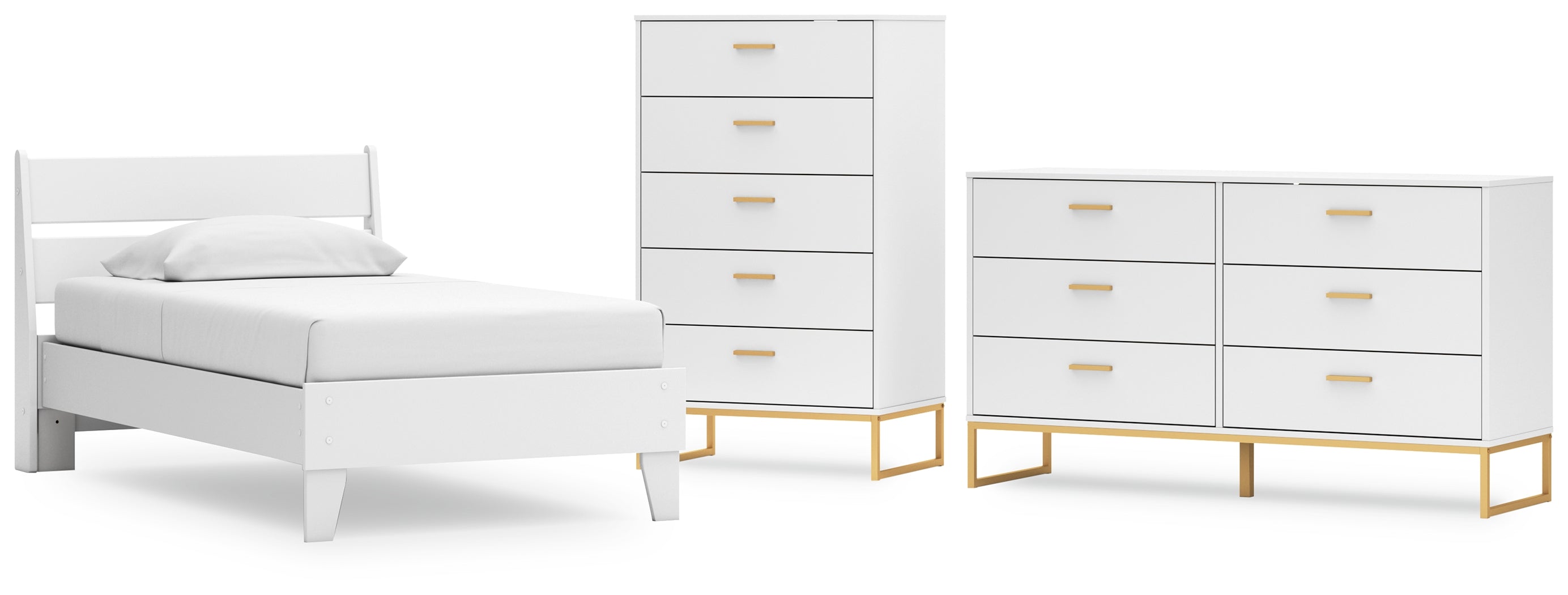 Light and bright, this bedroom package is inspired by chic design. A matte white finish and goldtone accents offer an elegant touch to this so-cool set. It beautifully blends the hues of natural living with the edginess of your modern lifestyle.