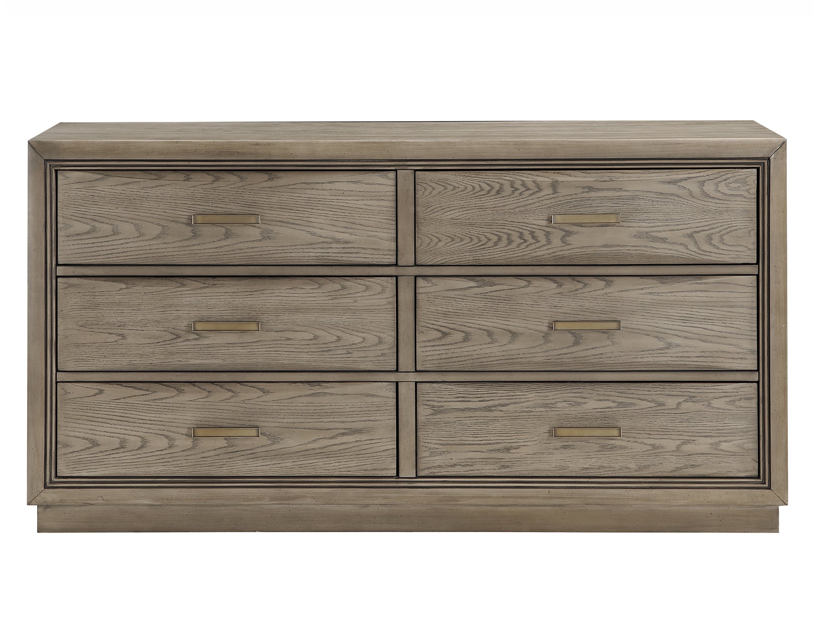 The Sonoma 6-Drawer Dresser effortlessly combines modern elegance with practical storage solutions. Its six spacious drawers provide ample room for your clothing, sweaters, and other essentials, all wrapped in a chic washed gray finish that adds a touch of sophistication to any bedroom. The burnished brass hardware adds a warm contrast, while the clean plinth base and subtly curved drawer fronts create a stylish focal point. This chest not only enhances the aesthetics of your space but also brings functional beauty to your everyday routine. Felt lined top drawers keep delicates snag free.