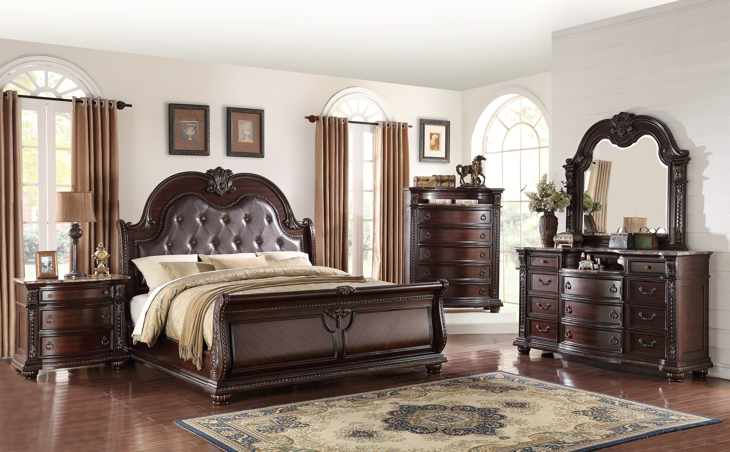 The Stanley Cherry Brown Upholstered Sleigh Bedroom Set by Crown Mark is a stunning addition to any bedroom. This elegant set features a beautifully crafted sleigh bed, complemented by a matching dresser, chest, mirror, and nightstand, all designed to bring a touch of sophistication to your space.