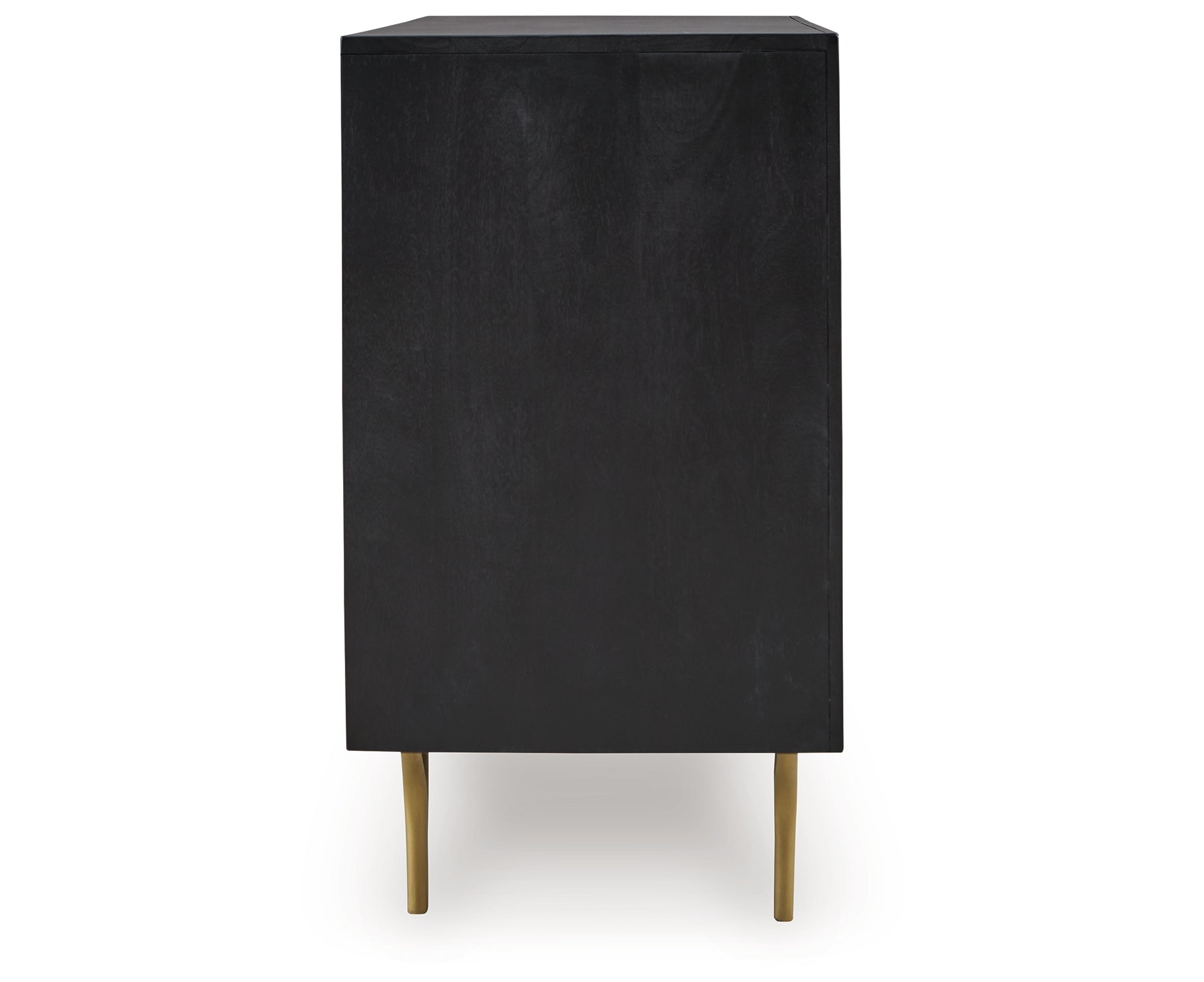 Style? Tons. Storage? Check. This accent cabinet adds more than just a contemporary cool design to your space. Finished in black and goldtone with a carved pattern on the door fronts, it conveys a sophisticated style that's perfect for a bar area. Push magnet doors open to reveal a shelf. After a long day of adulting, let this piece help you mix up a little reward. — Luna Furniture introduces Tayner Accent Cabinet to enhance the beauty of your living spaces.