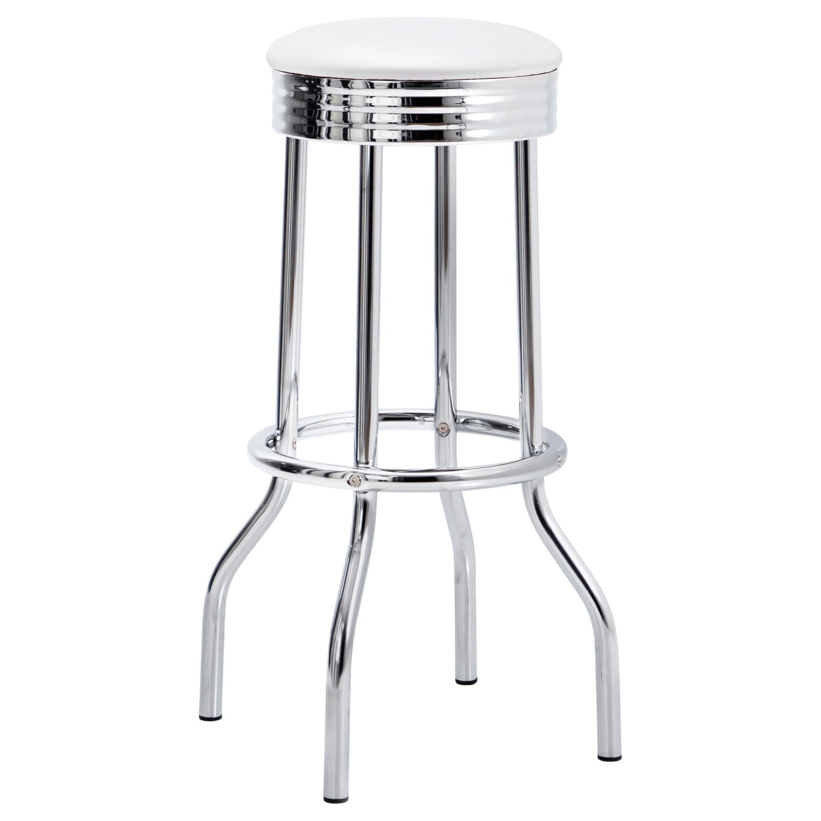 Let your mind wander to a mid-century ice cream parlor. The charm of retro influence makes its way into this fabulous bar stool. Using traditional materials such as chrome finish metal and cool white upholstery over its round raised cushion, it recreates an iconic piece of nostalgia. Pair this awesome stool with a coordinating or matching pub table. Breathe new life into a fun casual space with a marvelous gem.