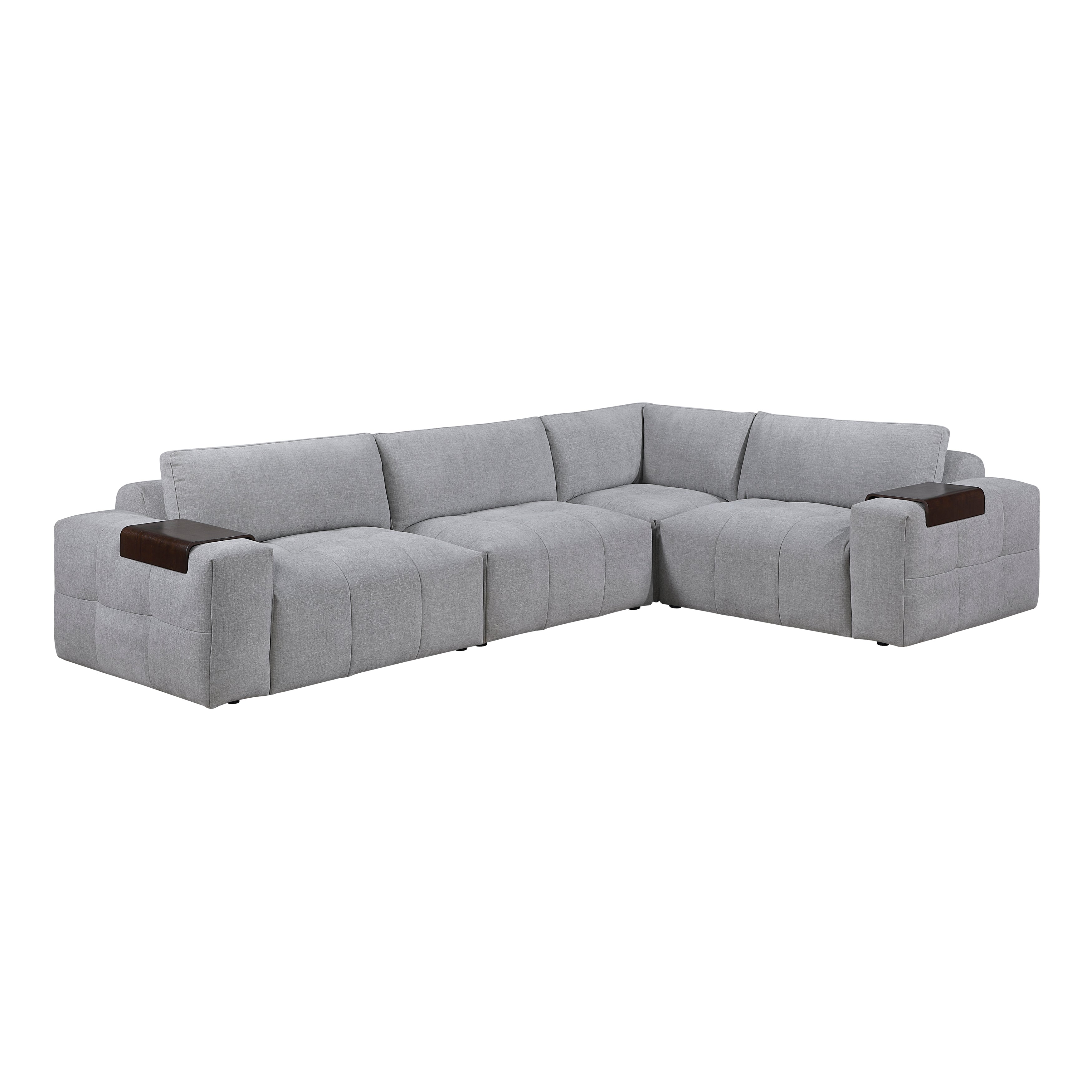 Transform your living room with this sophisticated 4-piece modular sectional, meticulously crafted to offer both designer style and customizable comfort. Wrapped in premium gray textured fabric with elegant tufting details, this set includes a left-arm chair, armless unit, corner seat, and right-arm chair. Featuring high-density foam cushions for lasting support and functional wooden armrest trays, this versatile sectional provides a luxurious lounging experience perfectly tailored to your modern home layout.