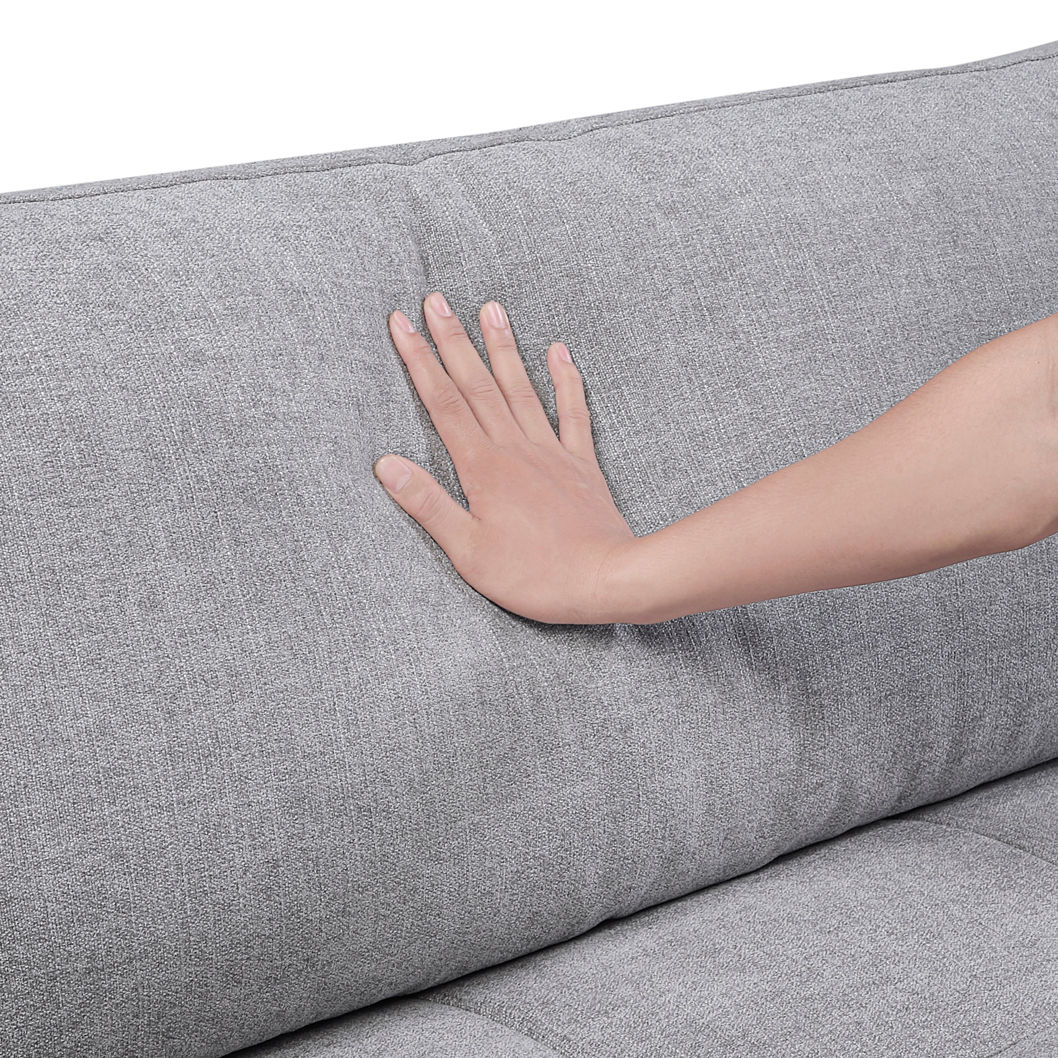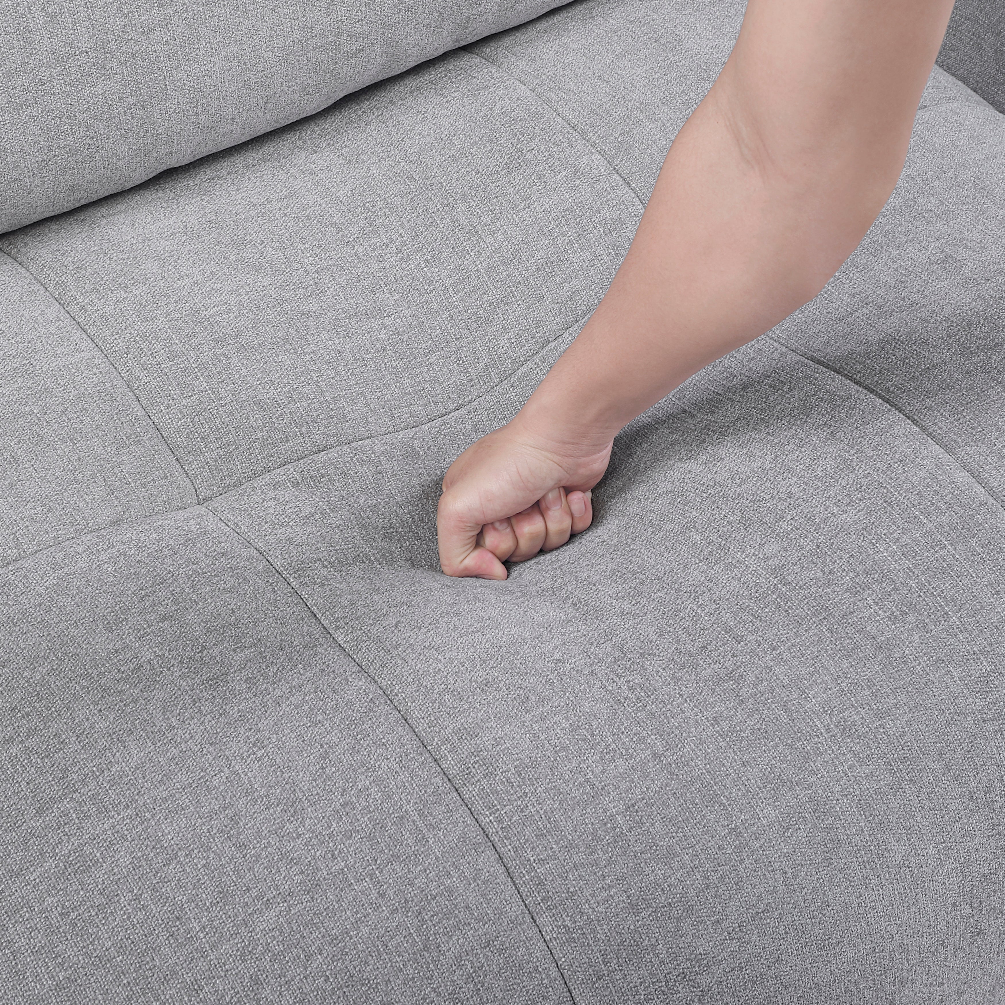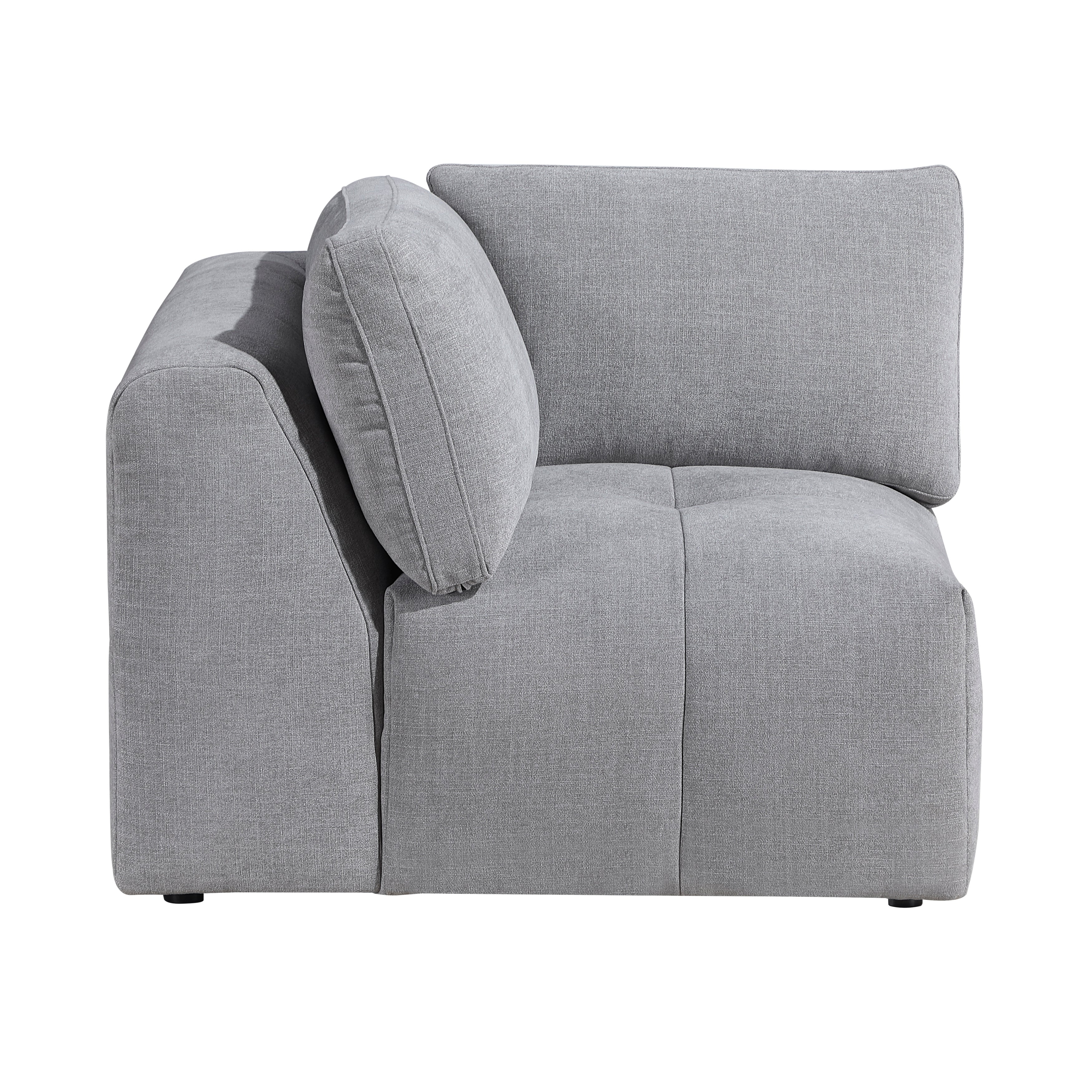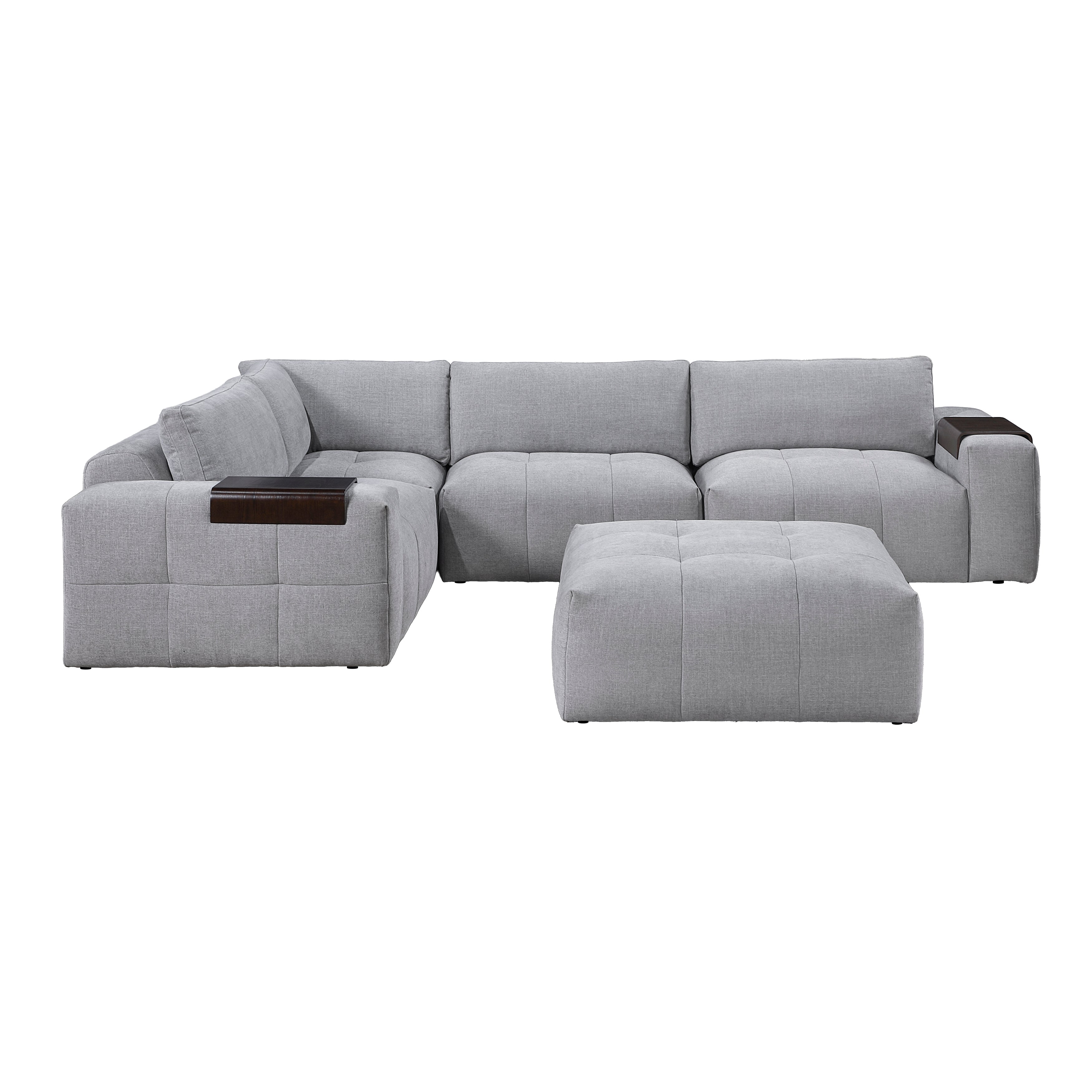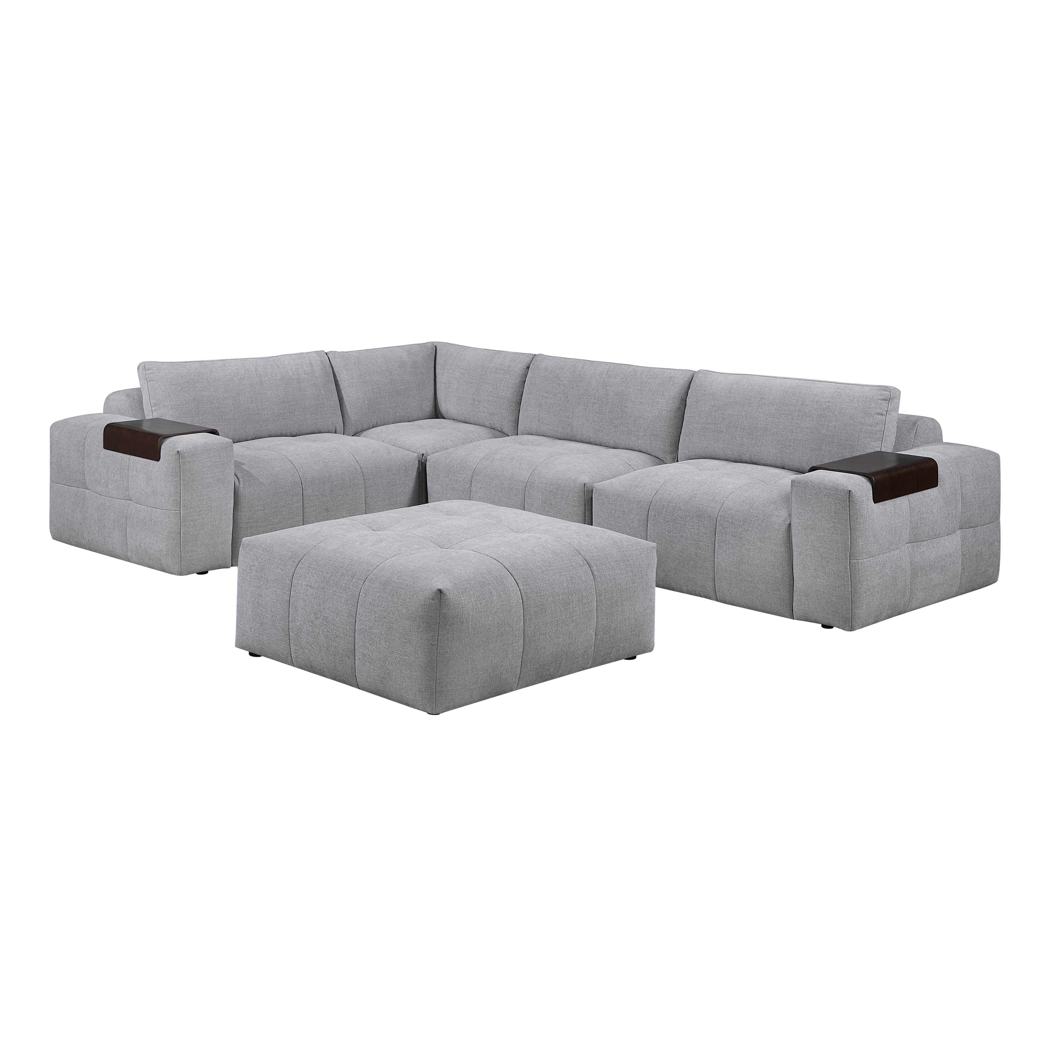 Elevate your living room with this versatile 5-piece modular sectional, designed for ultimate customization and contemporary style. Wrapped in premium gray textured fabric with elegant tufting details, this expansive set includes a left-arm chair, armless chair, corner seat, right-arm chair, and a mobile ottoman. Featuring high-density foam cushions and integrated wooden armrest trays, this sectional provides luxurious comfort and functional convenience, making it the perfect centerpiece for modern family gatherings.