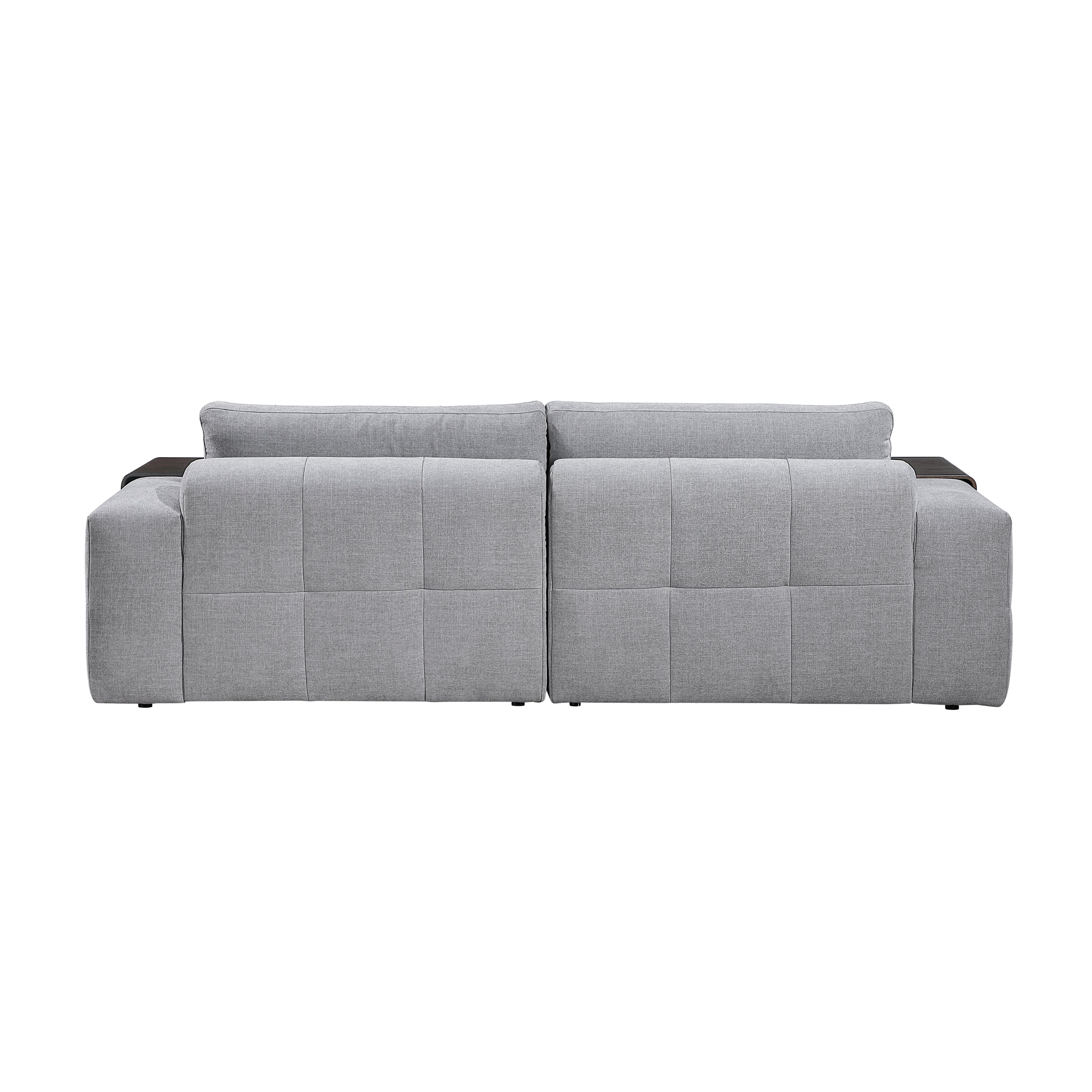 Redefine your lounging experience with this sophisticated gray loveseat, designed to bring contemporary elegance and functional luxury to your home. Featuring premium textured fabric upholstery with refined tufting details, this two-seater sofa is built on a robust plywood frame for lasting durability. Each side includes an integrated wooden armrest tray, providing a stable surface for drinks or devices, while high-density foam cushions ensure plush, long-lasting comfort in any modern living room.