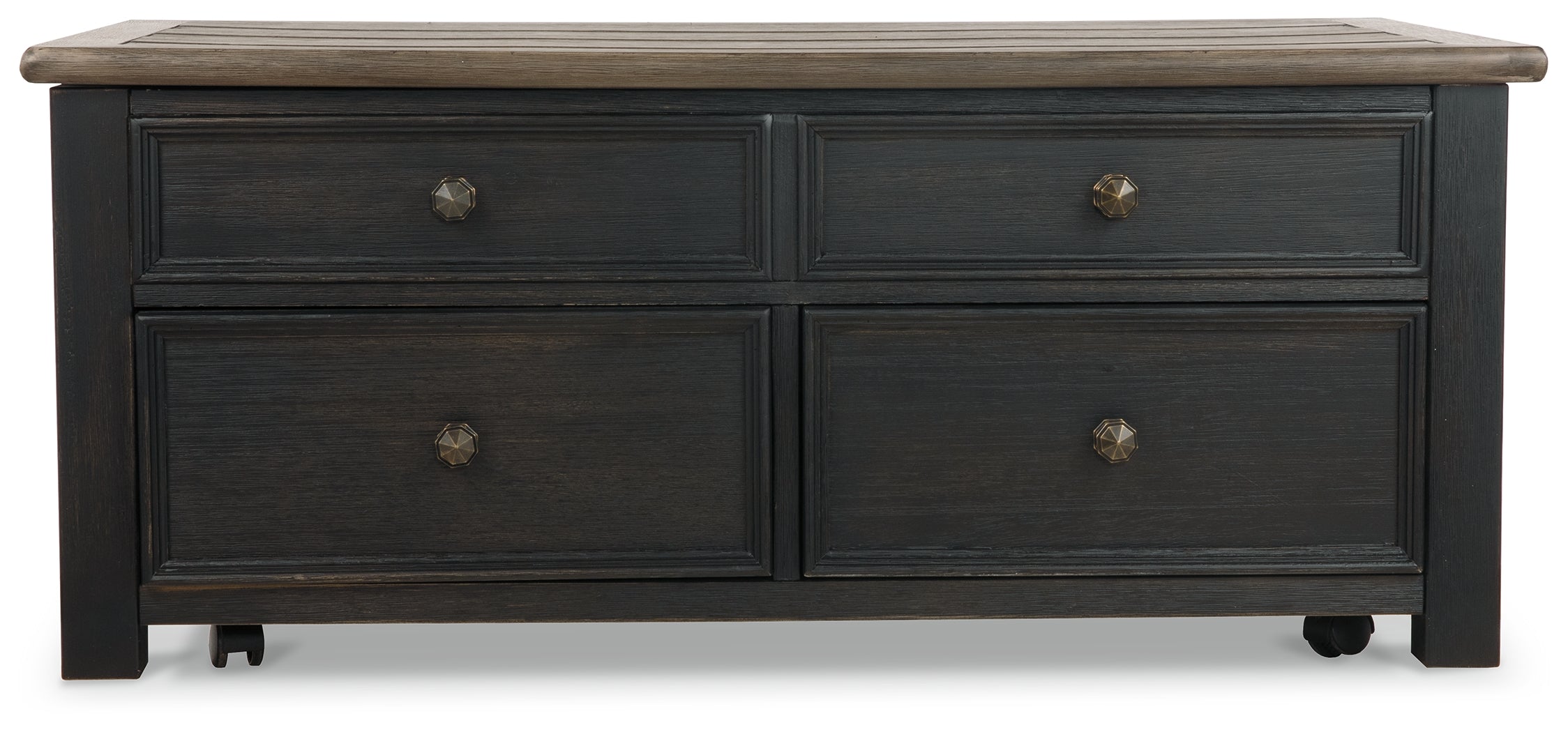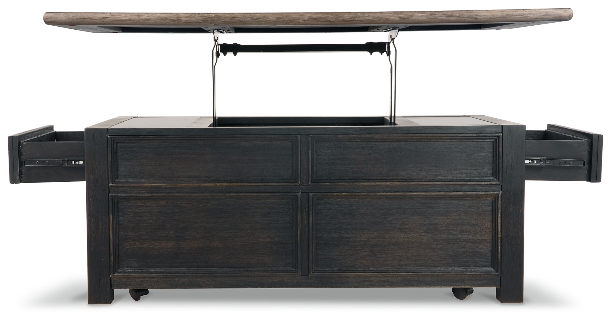 Shabby chic with a hint of down home country. This lift top coffee table with textured black finish, set of 2 end tables, and console is all the talk of today’s design world. Wood grain shows through the weathered gray-brown top in all of its earthy pleasure. Framed drawers are adorned with lovely traditional hardware. Smooth-gliding drawers make it easy for you to store away your belongings in style. Lift top transforms your space into a workstation without a hitch. Luna Furniture introduces Tyler Creek Coffee Table and 2 End Tables with Console to enhance the beauty of your living spaces.