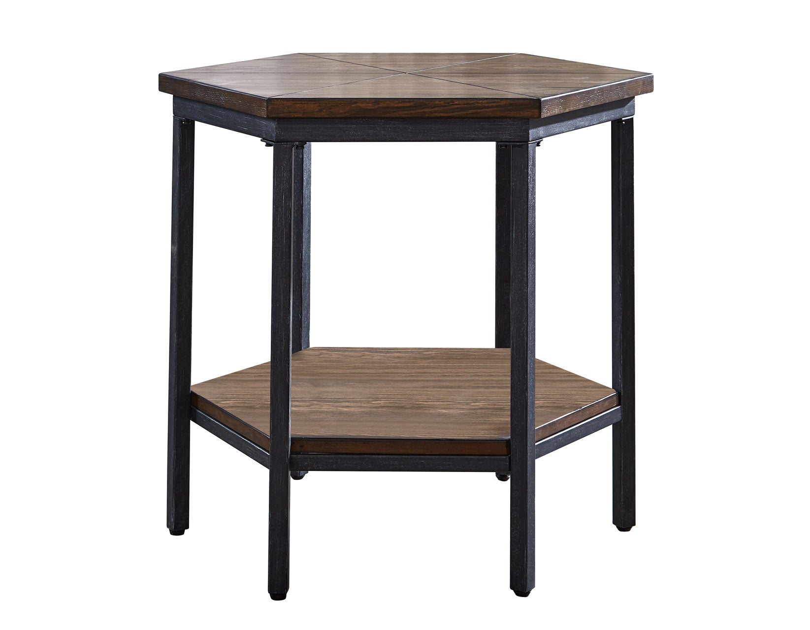 Mixed media occasional collection that features a castered lift-top cocktail table for easy mobility. The contemporary collection features an interesting hexagonal shape on the cocktail and end table accented by a hexagonal veneer layup top. The mocha finish and iron base add style to the functionality of the collection.