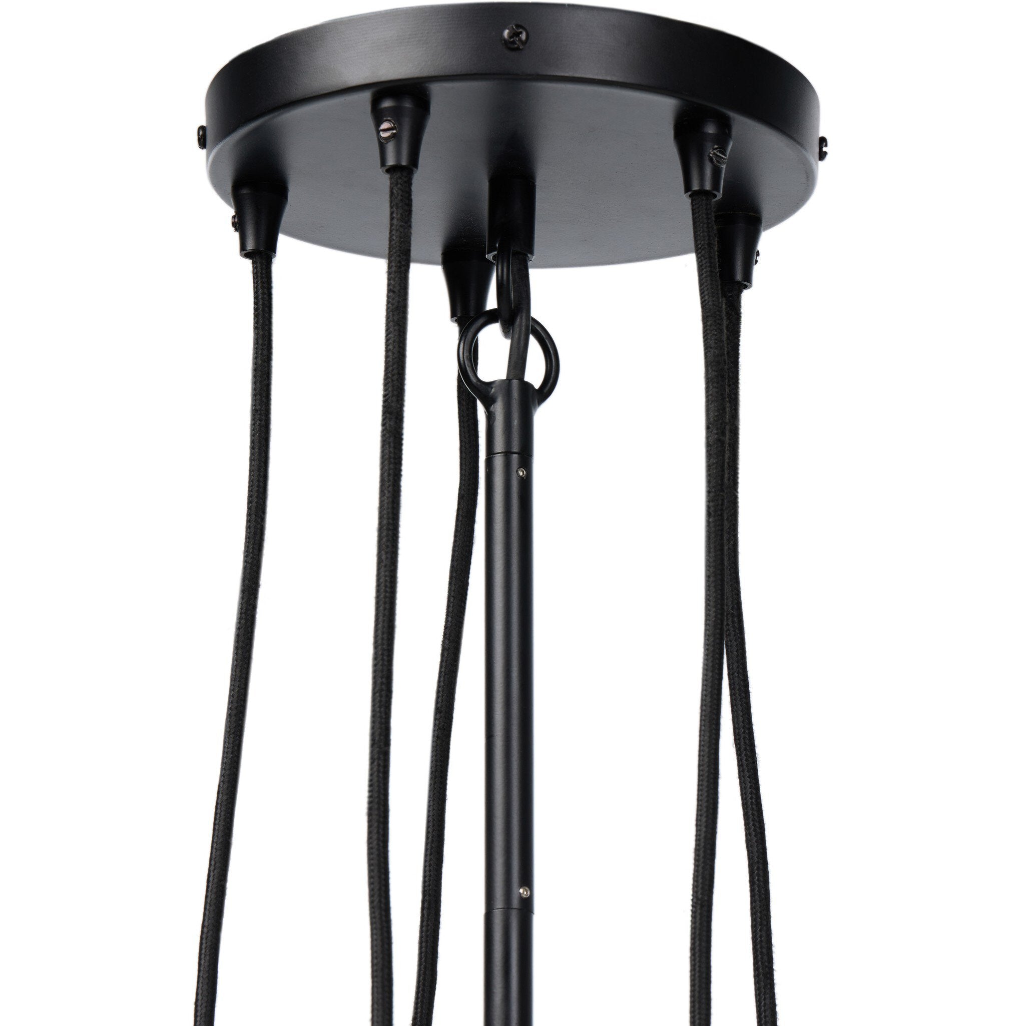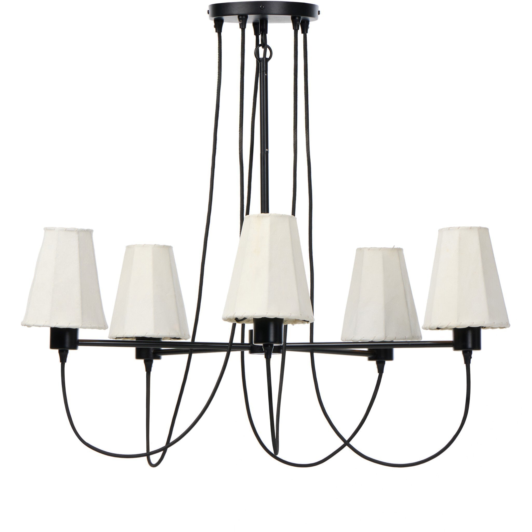 Modern precision meets classic design in this swooping chandelier. The curved iron arms create a sense of movement, while leather shades cast ambient light all around. This piece is not compatible with sloped ceilings. — Luna Furniture introduces Webster Chandelier in Jet Black to enhance the beauty of your living spaces.