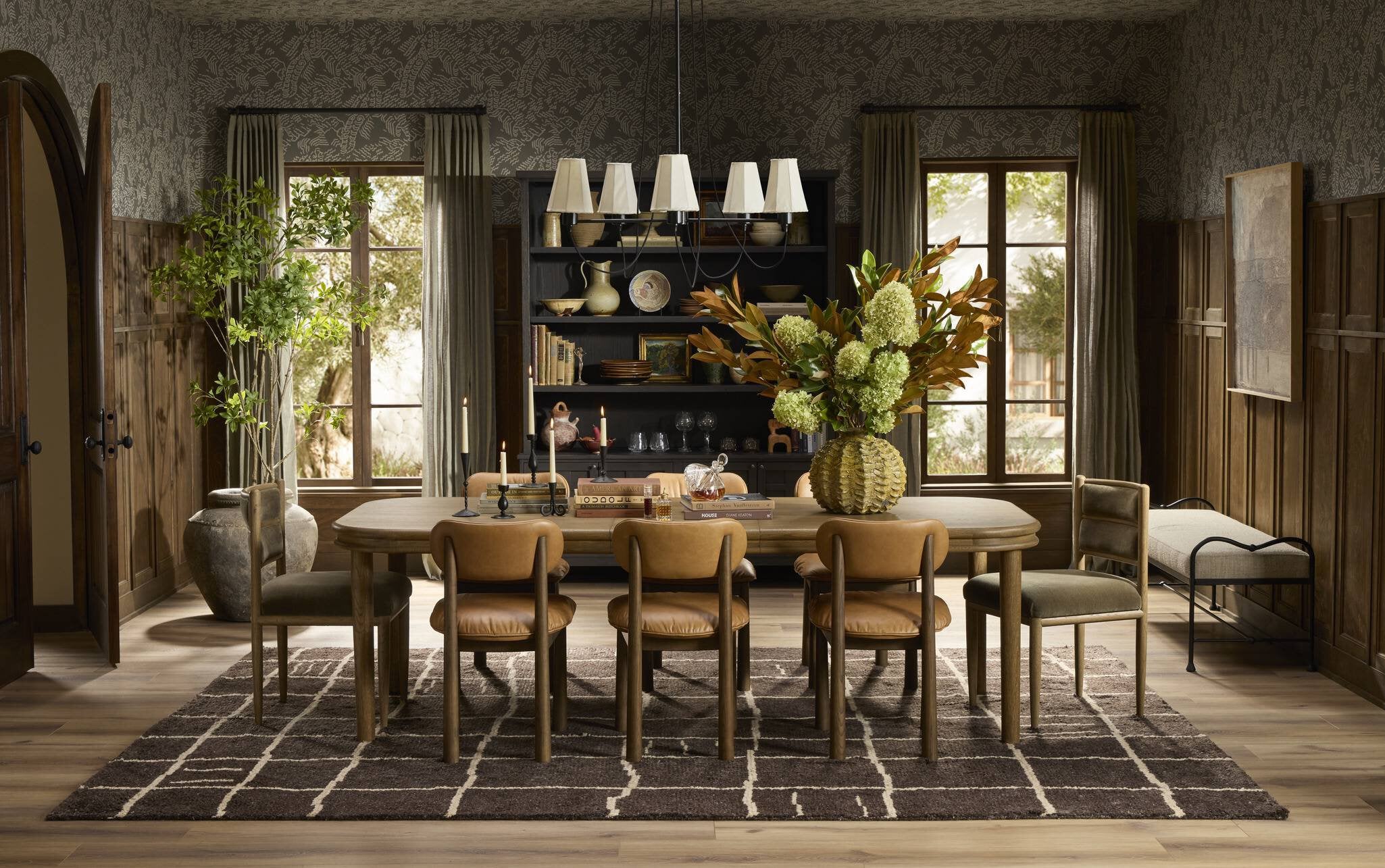 - Modern precision meets classic design in this swooping chandelier. The curved iron arms create a sense of movement, while leather shades cast ambient light all around. This piece is not compatible with sloped ceilings.
