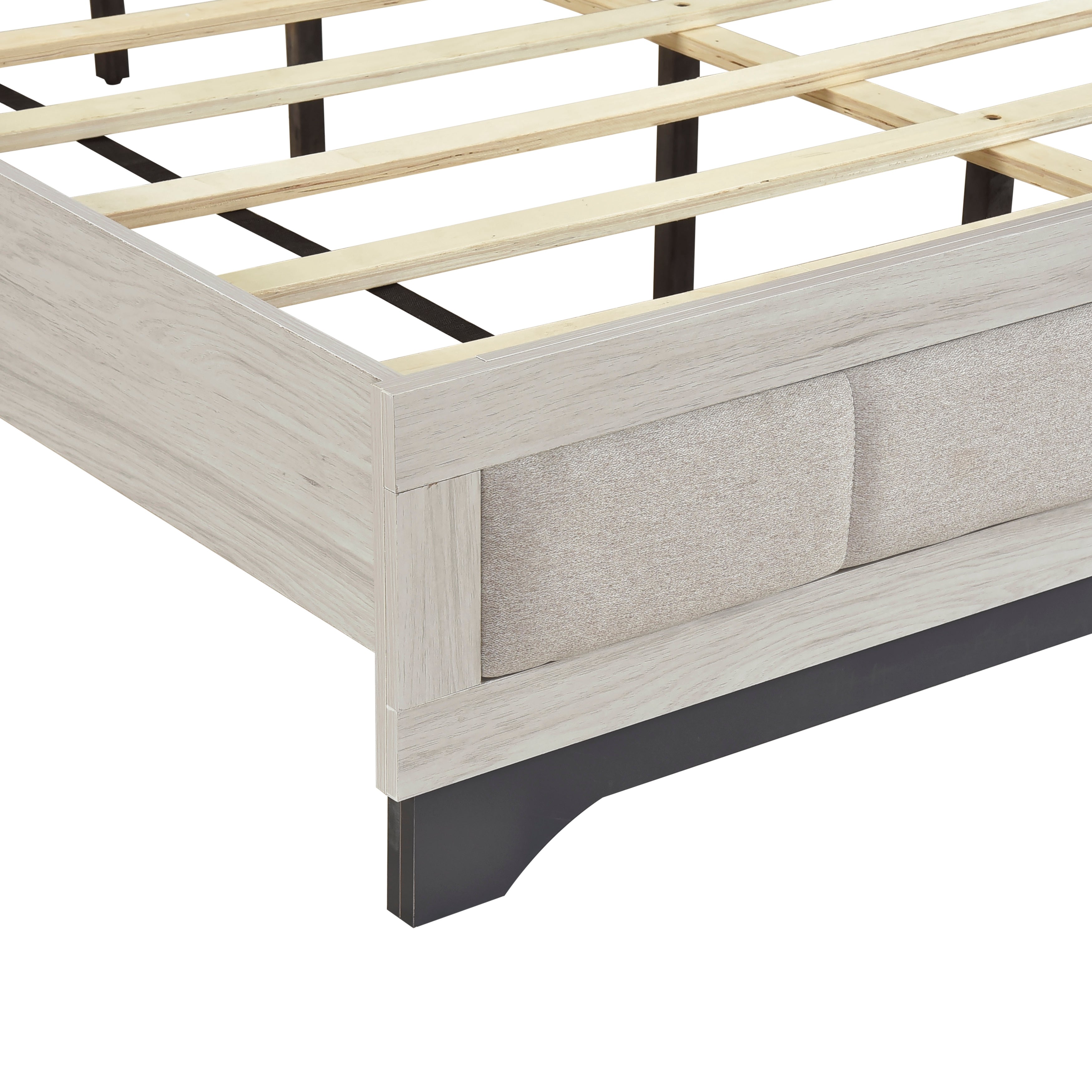 Elevate your bedroom's aesthetic with this stylish and contemporary bed frame, featuring a striking two-tone white oak and gray finish. Crafted from a durable blend of lamination paper, wood, and engineered wood, this bed offers a modern look with exceptional stability. The plush upholstered headboard and footboard, padded with soft foam and covered in a chic fabric, provide inviting comfort and a touch of sophistication. This complete bed set includes the headboard, footboard, and rails, ensuring a cohesive and sturdy foundation for your mattress. While assembly is required, its unique blend of textures and colors makes it an ideal centerpiece for any modern or transitional bedroom, creating a cozy and stylish retreat (foundation/box spring required).