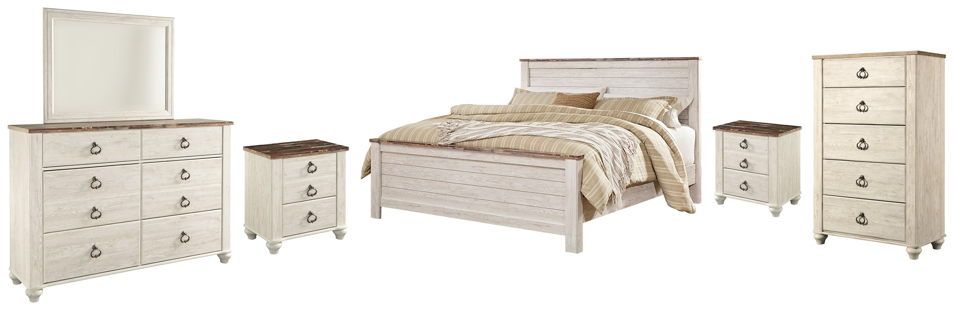 Willowton California King Panel Bed with Mirrored Dresser, Chest and 2 Nightstands in Whitewash