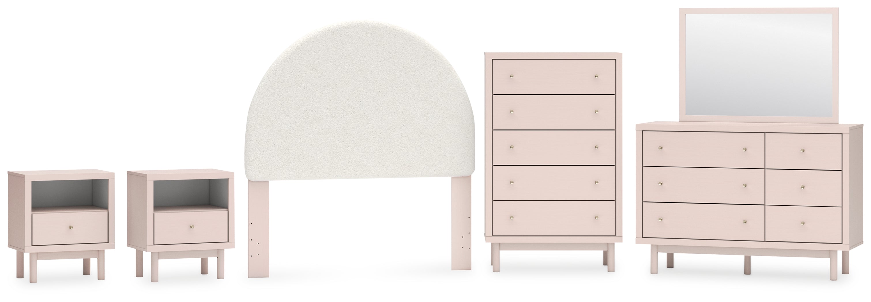 Wistenpine Full Upholstered Panel Headboard with Mirrored Dresser, Chest and 2 Nightstands in Blush