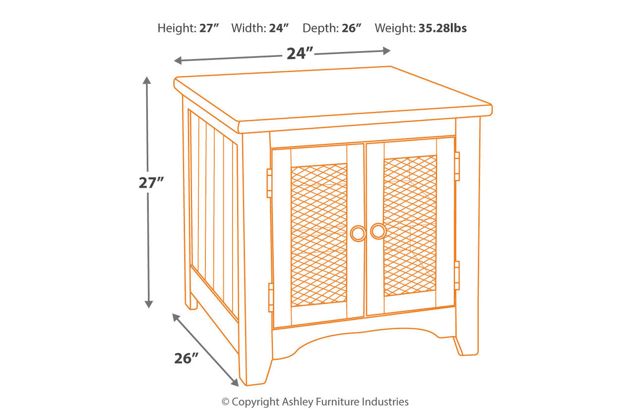 Double take. Sporting a two-tone finish that pairs a distressed vintage white with aged natural pine color, this end table elevates the art of rustic farmhouse living. Enhancing its charm: shelved storage visible through cabinet doors with inset metal grills. — Luna Furniture introduces Wystfield End Table to enhance the beauty of your living spaces.